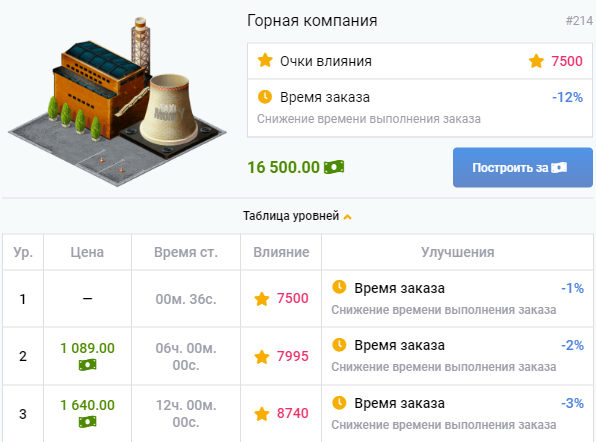 Последующее повышение уровня здания Вашей горной компании приведёт к снижению времени добычи руды всеми сотрудниками компании. Кроме того, улучшение этого здания также увеличит количество очков влияния в районе — а значит, приведёт к увеличению Вашего пассивного дохода от инвестиций в виртуальную недвижимость Taxi-Polis.