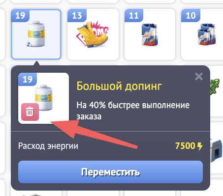 Все товары в инвентаре можно (и даже иногда нужно!) удалять. Для этого достаточно кликнуть по специальной иконке с "корзиной" на изображении товара