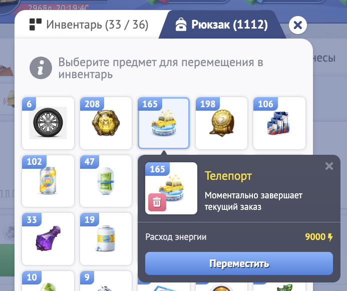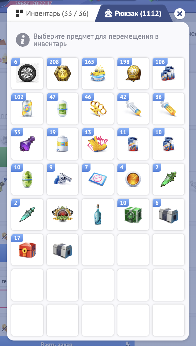 Если Ваш инвентарь заполнен - не переживайте! Все получаемые Вами товары будут бережно размещены в Рюкзаке.