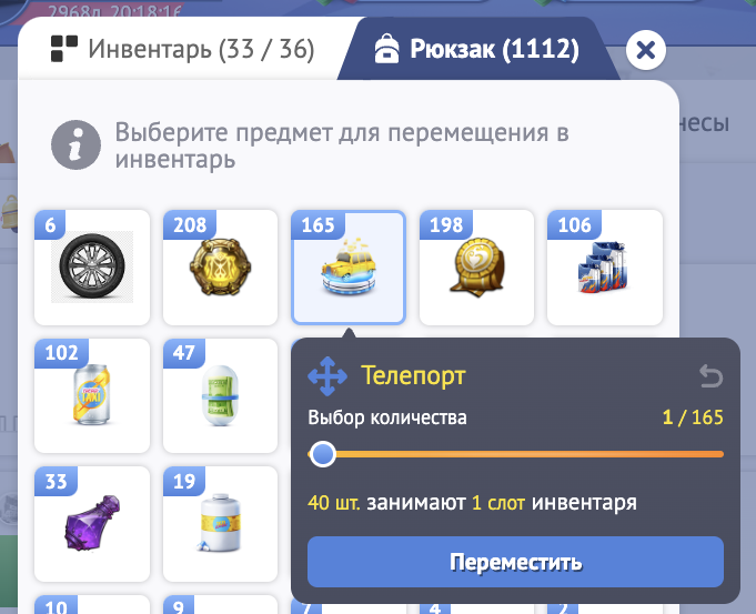 Затем нажмите на кнопку "Переместить" и выберите количество товара, которое хотите переместить в инвентарь!